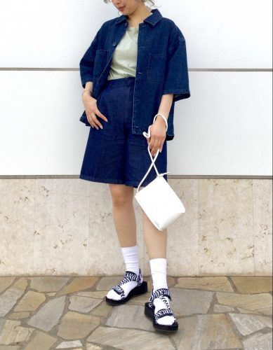 半袖のデニムシャツに同素材のバミューダパンツを合わせたセットアップコーデ。メンズアイテムですが男女兼用で着られます。流行りのオーバーサイズコーデに仕上がるので、好みのサイズ感をGETして♡ インナーにカットソーを合わせれば、ちょっと肌寒い梅雨コーデにぴったり。