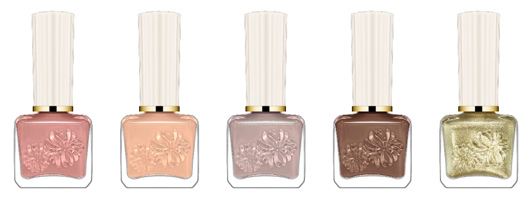 ランジェリーからインスパイアされた繊細なパール入りのくすみ系カラー。ヌーディーなアプリコットベージュ「805 コルセット アフェア」、くすみ系の大人パステル「808 スタンディングオベーション」、オシャレな手元に見えるグレイッシュパール「810 シルキー ネグリジェ」。キャップもランジェリー風なプリントで、見た目も大人っぽいのが女心くすぐります♡