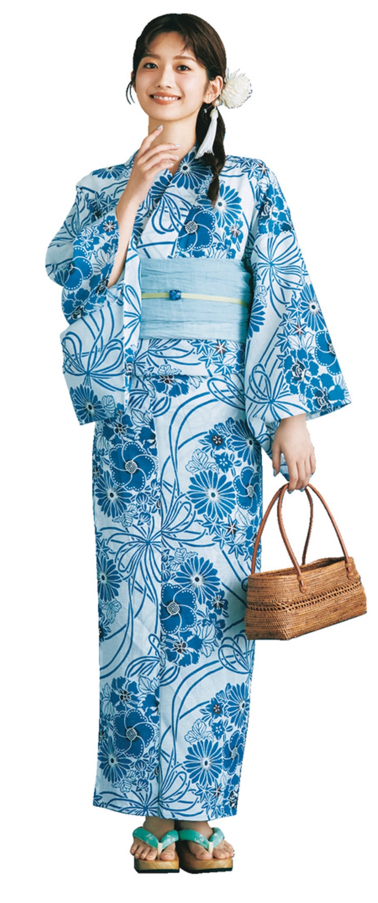 大胆に描かれた花柄も、淡い水色地と同系色の組み合わせなら品よくまとまる♡ 帯&下駄の鼻緒もブルーでそろえて今っぽワントーンに。