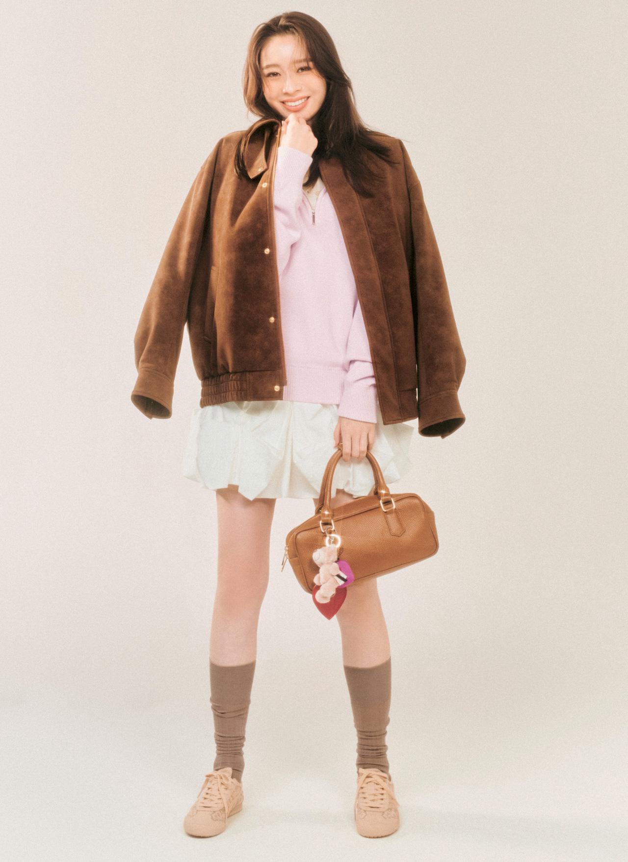 甘辛ミックスで、ミニスカートも洒落顔で攻略。ラフにはおったブラウンのスエード調ブルゾンで、甘めのインナーコーデをピリッと引き締めて。