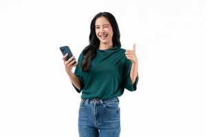 • Cheerful,Beautiful,Asian,Woman,Holding,Smartphone,With,Shows,Like,Sign