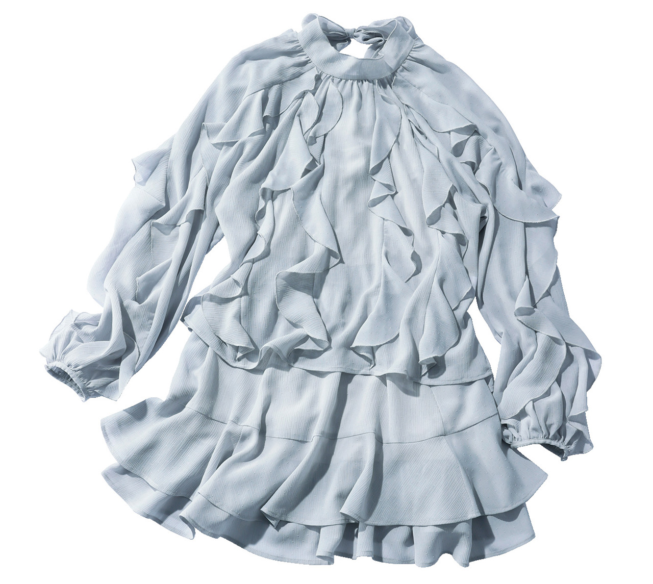 裾ティアードキャミワンピに縦フリルブラウスを被せた、レイヤードタイプ。こなれた甘さを目指したいなら、大人めライトグレーを指名買い!
