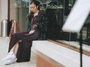 【コーデセット①】起きて5分で完璧!「レザージャケット×ヴィンテージ柄ワンピ」の着こなし実例