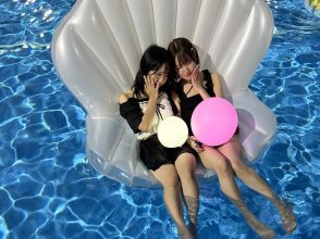 「CanCamナイトプール」を象徴するユニークなフロートや、キラキラ光るLEDボールは写真映え間違いなし。なんと今年は、お花も水面にぷかぷか浮かんでいます!