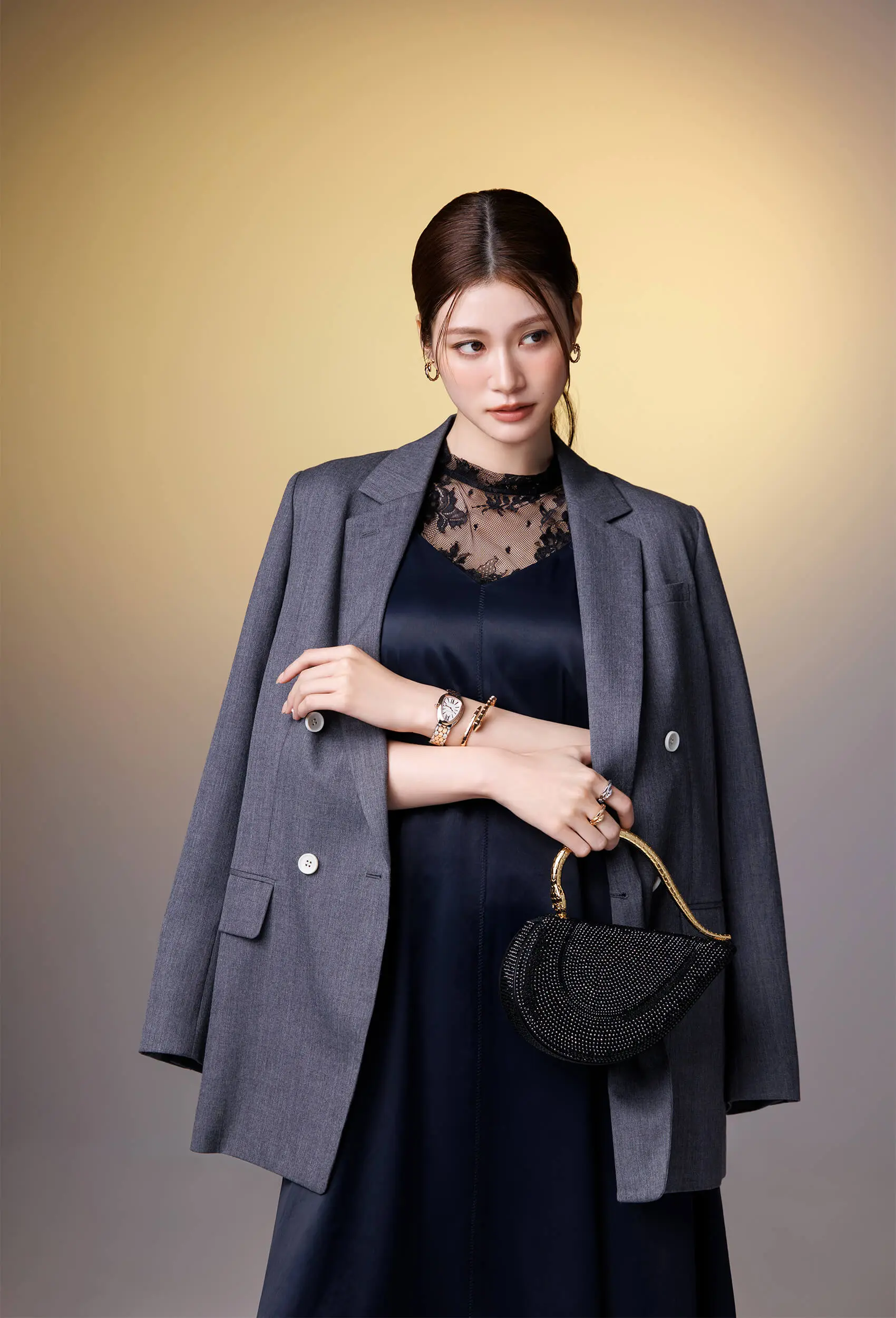 時計[SS x PG x D]¥1,474,000・リング[人差し指/WG]¥418,100・リング[中指/PG]¥389,400・ピアス[PG]¥503,800・ブレスレット[PG]¥1,094,500・バッグ[11×18×4]¥1,012,000(ブルガリ・ジャパン<ブルガリ>)、ジャケット¥29,700・ワンピース¥35,200(ánuans)