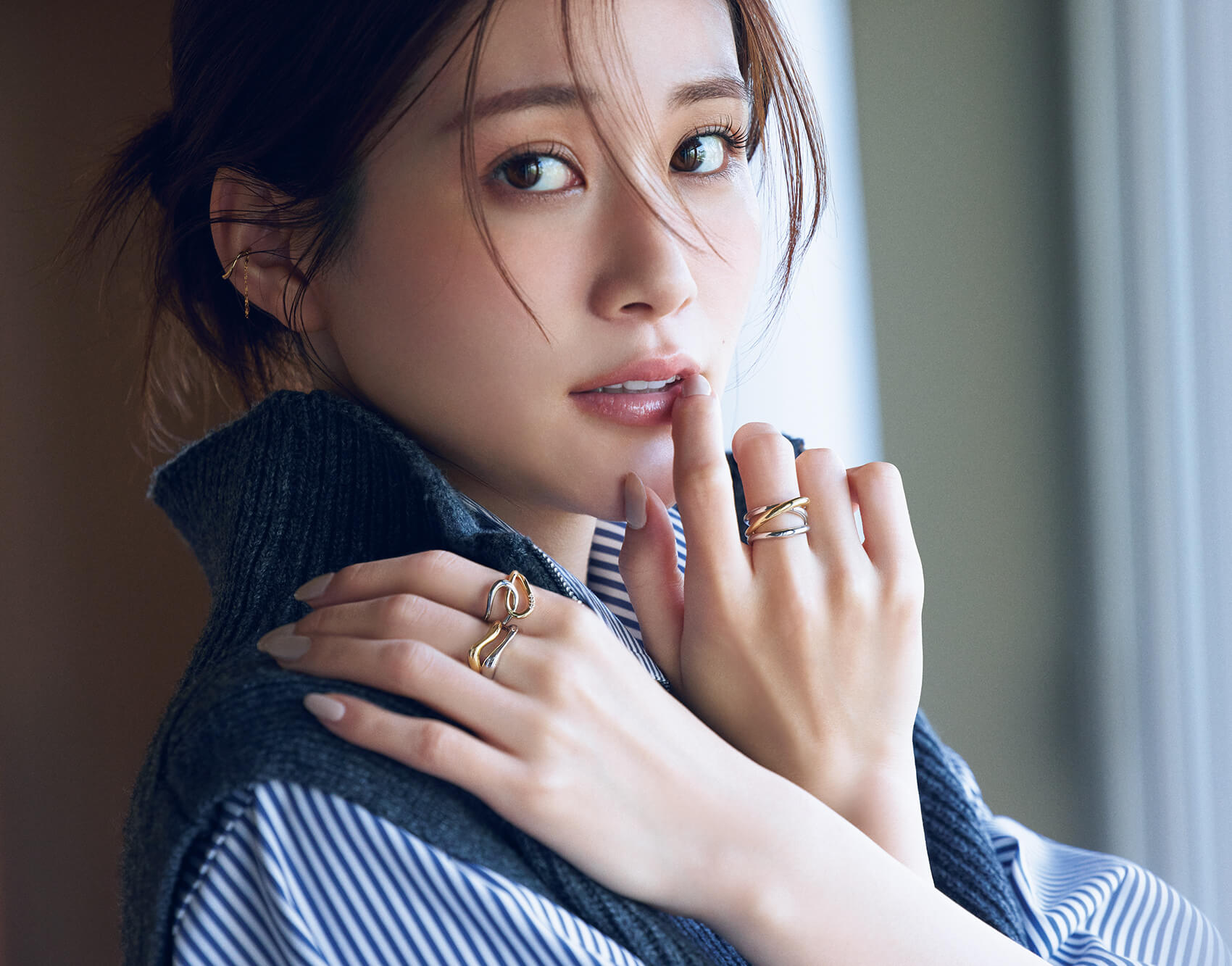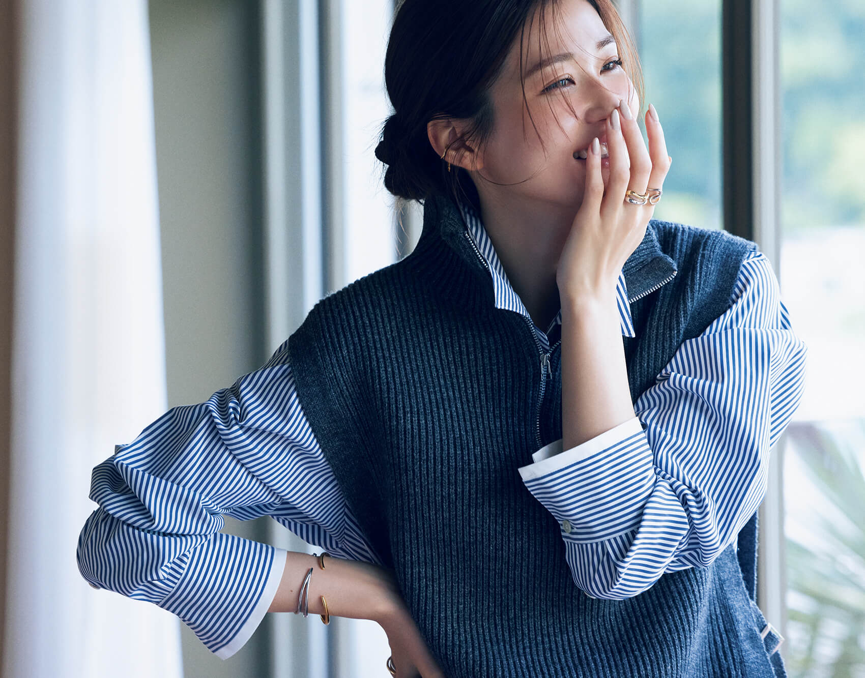 水の躍動感をイメージして作られた上品なボリューム感は、身につけるだけできれいなお姉さんムード。カジュアルな地金系リングも、抜け感のあるデザインと艶やかな輝きでエレガントな佇まいに。リング[右手中指/SV(Ptコーティング+K18YGコーティング)]¥19,800・[左手人さし指/SV(Ptコーティング+K18YGコーティング)×DIA]¥22,000・[左手中指/SV(Ptコーティング+K18YGコーティング)]¥19,800・イヤカフ[SV(K18YGコーティング)/K10YG(チェーンのみ)]¥9,900・バングル[手首側/SV(K18YGコーティング)]¥29,700・[ひじ側/SV(Ptコーティング)]¥38,500・(エフ・ディ・シィ・プロダクツ〈4℃〉)、ニット¥18,700(アルページュストーリー)、シャツ¥17,600(アプワイザー・リッシェ)