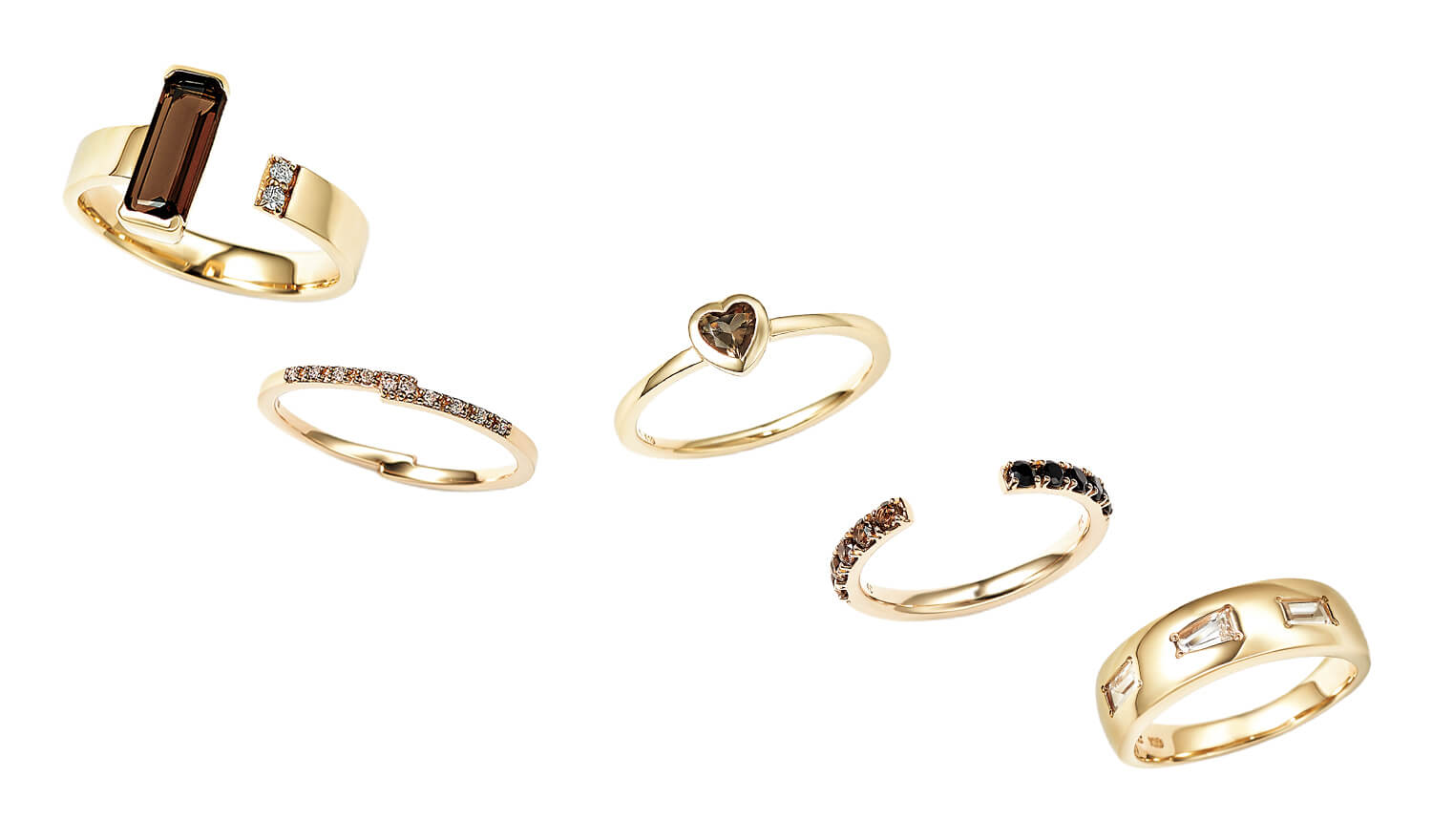 今季イチ推しのブラウンダイヤモンドは、落ち着いた温かみのある輝きが大人の余裕を演出。ハートモチーフや幅広リングなど、キャッチーさもMIXしたデザインで即こなれ見え。ネックレス[上/K10YG×ブラウンDIA]¥41,800・[下/K10YG×ブラウンDIA]¥55,000・リング[右手人さし指/K10YG×スモーキークォーツ×ホワイトトパーズ]¥90,200・[右手中指/K10YG×ブラウンDIA]¥55,000・[左手人さし指・上/K10YG×スモーキークォーツ]¥41,800・[左手人さし指・下/K10YG×ブラックカルセドニー×スモーキークォーツ]¥69,300・[左手中指/K10YG×クォーツ]¥110,000・ピアス※片耳[K10YG×スモーキークォーツ]¥24,200(エフ・ディ・シィ・プロダクツ〈4℃〉)、ジャケット¥31,900(アルページュストーリー)、キャミソール¥9,900(ánuans)