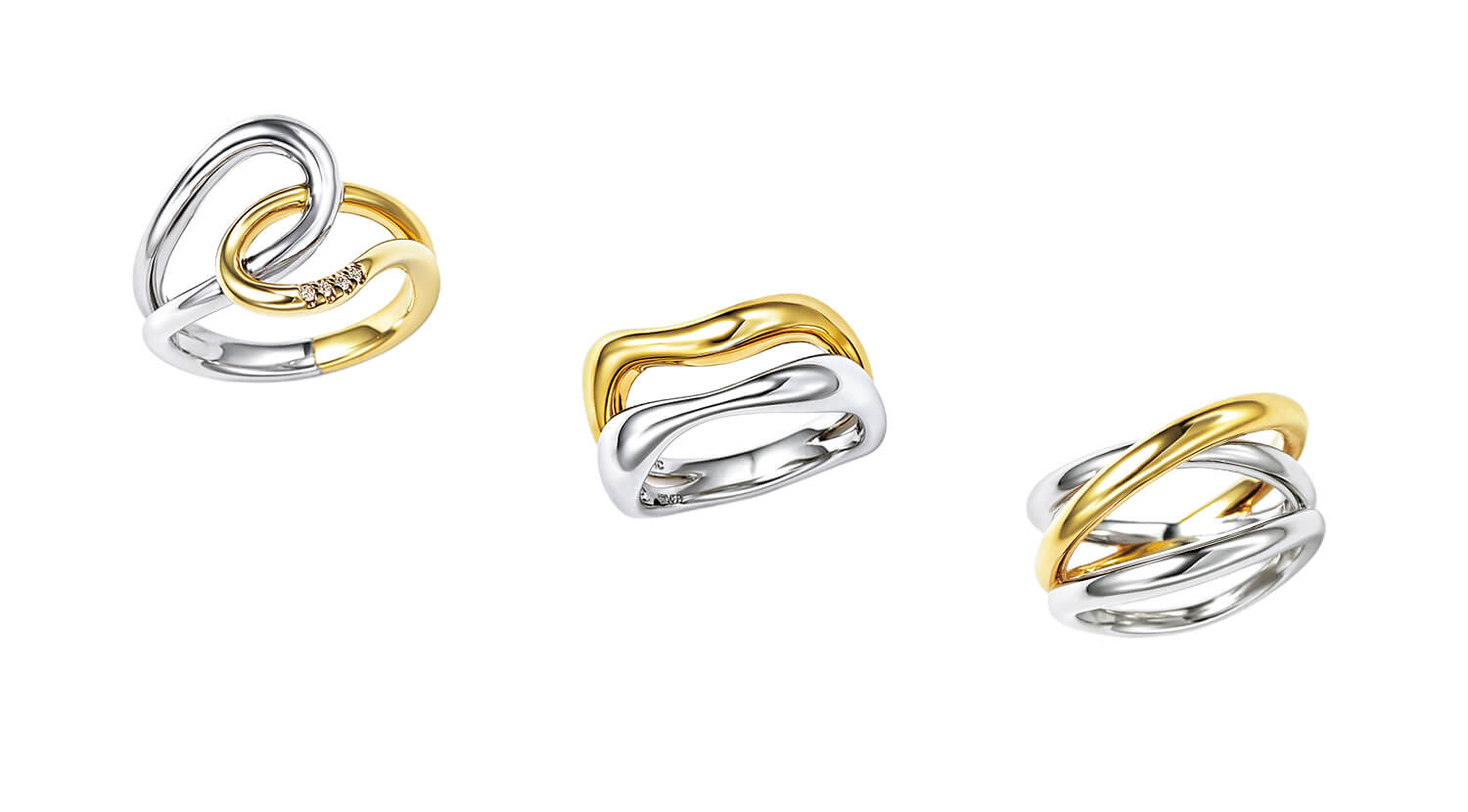 4℃の原点である「水」をモチーフに、ぷるんと瑞々しく立体感のあるフォルムが特徴。ゴールド&シルバーのコンビが華やかな地金系リングは、ひとつ取り入れるだけでもトレンド感たっぷりの手元に仕上がる!