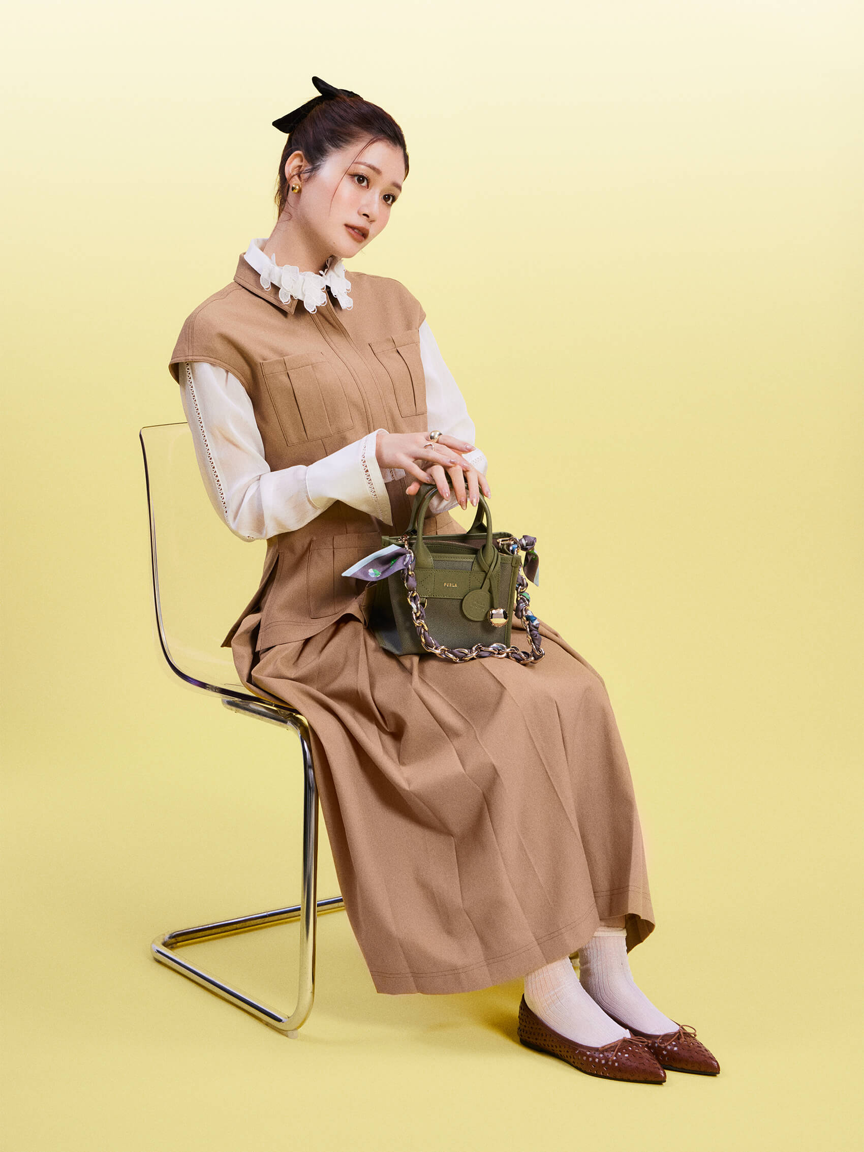 バッグ[16×17×9.5]¥49,500・チェーンハンドル¥4,400・スカーフ¥15,400(フルラ ジャパン<フルラ>)、ブラウス¥22,000・ベスト¥17,600・スカート¥19,800(ローブブラン)、靴¥46,200(エフイーエヌ<プリティ・バレリーナ>)、靴下¥990(Tabio<靴下屋>)、ヘアアクセ¥6,600(ジャルダン ドゥ シャプー)、イヤリング¥19,800・リング[人さし指]¥25,300・リング[中指]¥19,800(アルティーダ ウード)