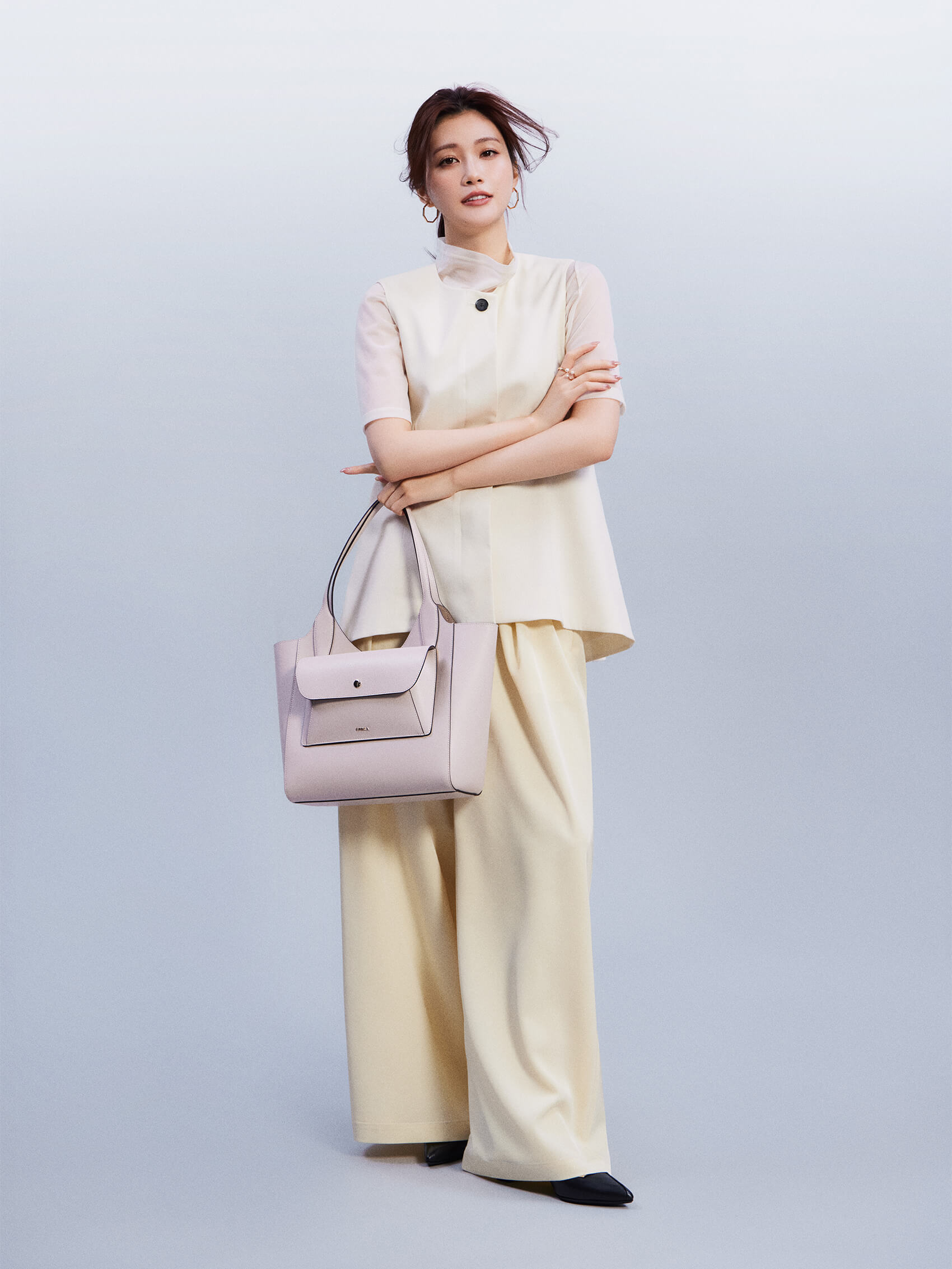 荷物がしっかりと入る実用的なサイズ&スマートなたたずまいで、通勤のお供にもぴったりな“フルラ レア”。清潔感たっぷりな淡いピンクのトートバッグにほんのりと色づくイエローを馴染ませて、春の爽やかなムードを感じるニュアンスカラーコーデに。柔らかな配色のおかげで、キリリとしたパンツスタイルもどこかエレガントな表情に仕上がる。