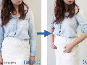 実はシャンパンゴールドのビジュー付きリボンベルトも付いていて、2WAYで楽しめます。流れるようなスカートの裾の美しいラインに、デザイナー小脇さんのこだわりが込められています。