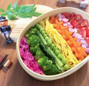 ヘルシー食材を使った七色弁当。トマト、ベーコン、人参、卵、枝豆、小松菜、ブロッコリー、紫キャベツをごはんの上に敷き詰めました。(@06oooyy)