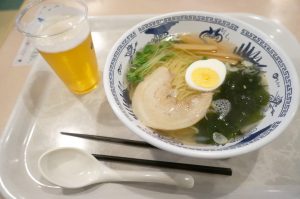 レストランにも行ってみたところ島塩ラーメンなるものがあるらしいのでいただくことに! さらに、アルコールを飲んでおくと三半規管がまひして揺れを感じにくくなるという情報を聞いたのでビールも一緒に……。(※ただし、人によっては揺れをより強く感じる場合があるので、自己責任でお願いします)
