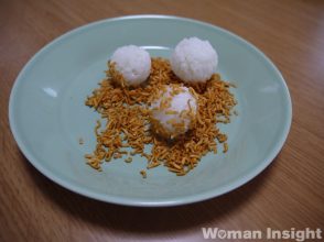 4. パーツをコロッケにのせ、衣でつくった耳は1cm程度のスパゲティでさしてとめる。