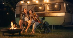 • Young,Beautiful,Couple,Relaxing,At,A,Caravan,Camping,Area,In